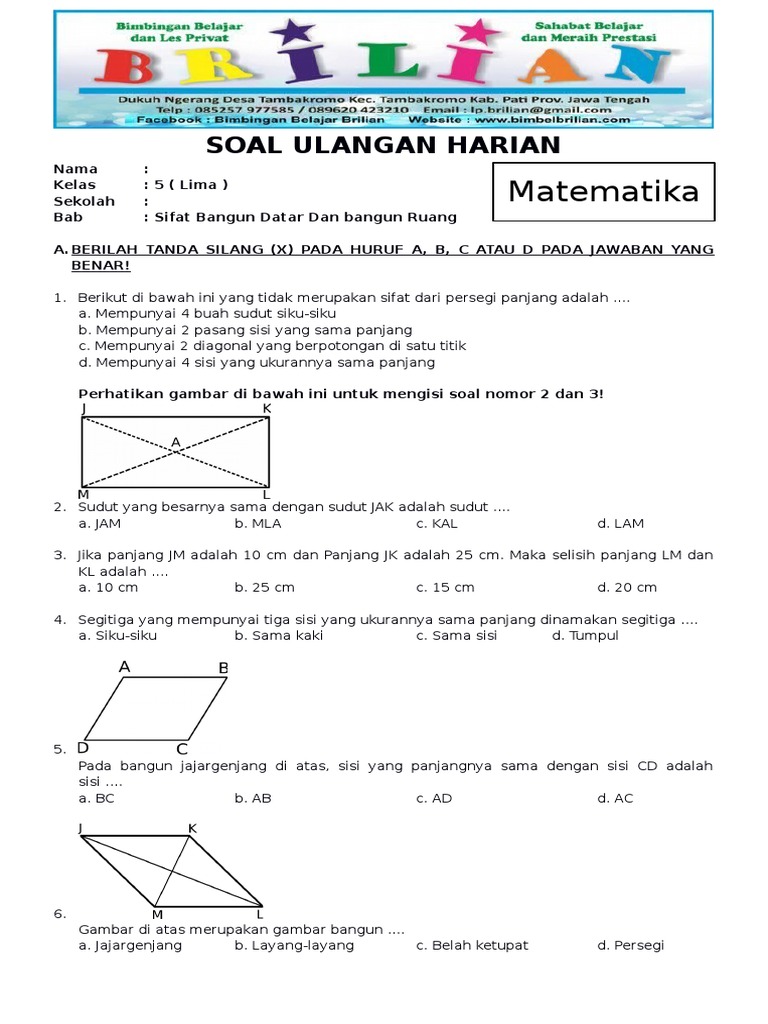 Berikut adalah kumpulan soal yang dirancang untuk menguji pemahaman siswa mengenai sifat-sifat bangun ruang.