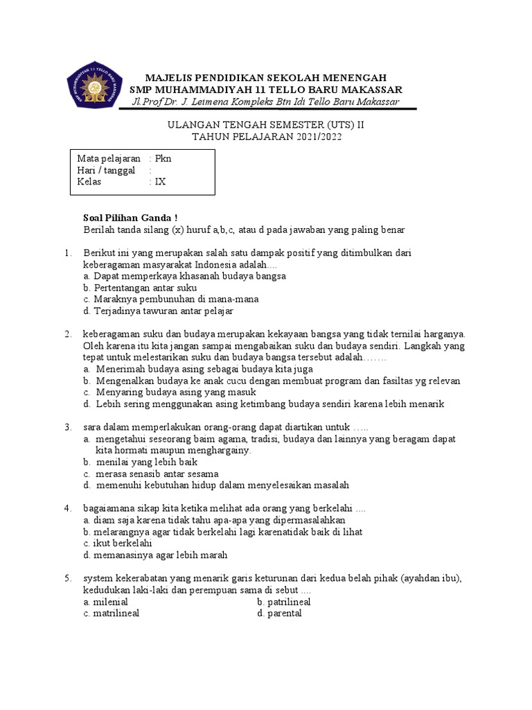 Untuk menguji pemahaman siswa tentang materi ini, soal pilihan ganda sering digunakan sebagai alat evaluasi. Artikel ini akan menyajikan contoh soal pilihan ganda PKN kelas 10 Bab 2 beserta pembahasan lengkapnya. Tujuannya adalah untuk membantu siswa mempersiapkan diri menghadapi ujian, memperdalam pemahaman tentang UUD 1945, dan menumbuhkan kesadaran akan pentingnya konstitusi dalam kehidupan berbangsa dan bernegara.